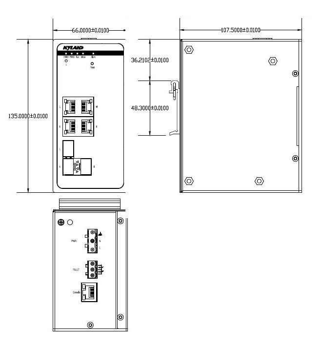 | 機械結構 | 外殼:金屬材質 散熱方式:自然冷卻,無風扇 防護等級:IP40 尺寸:66mm×135mm×107.5mm(W×H×D) 重量:1.25Kg 安裝方式:DIN卡軌式或壁掛式 |