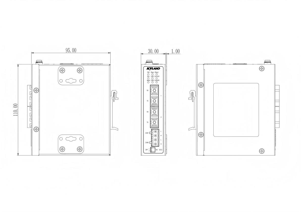 | 機械結構 | 外殼:金屬材質 設備尺寸:30×110×95mm(W×H×D) 散熱方式:自然冷卻,無風扇 防護等級:IP40 安裝方式:壁掛,導軌 |
