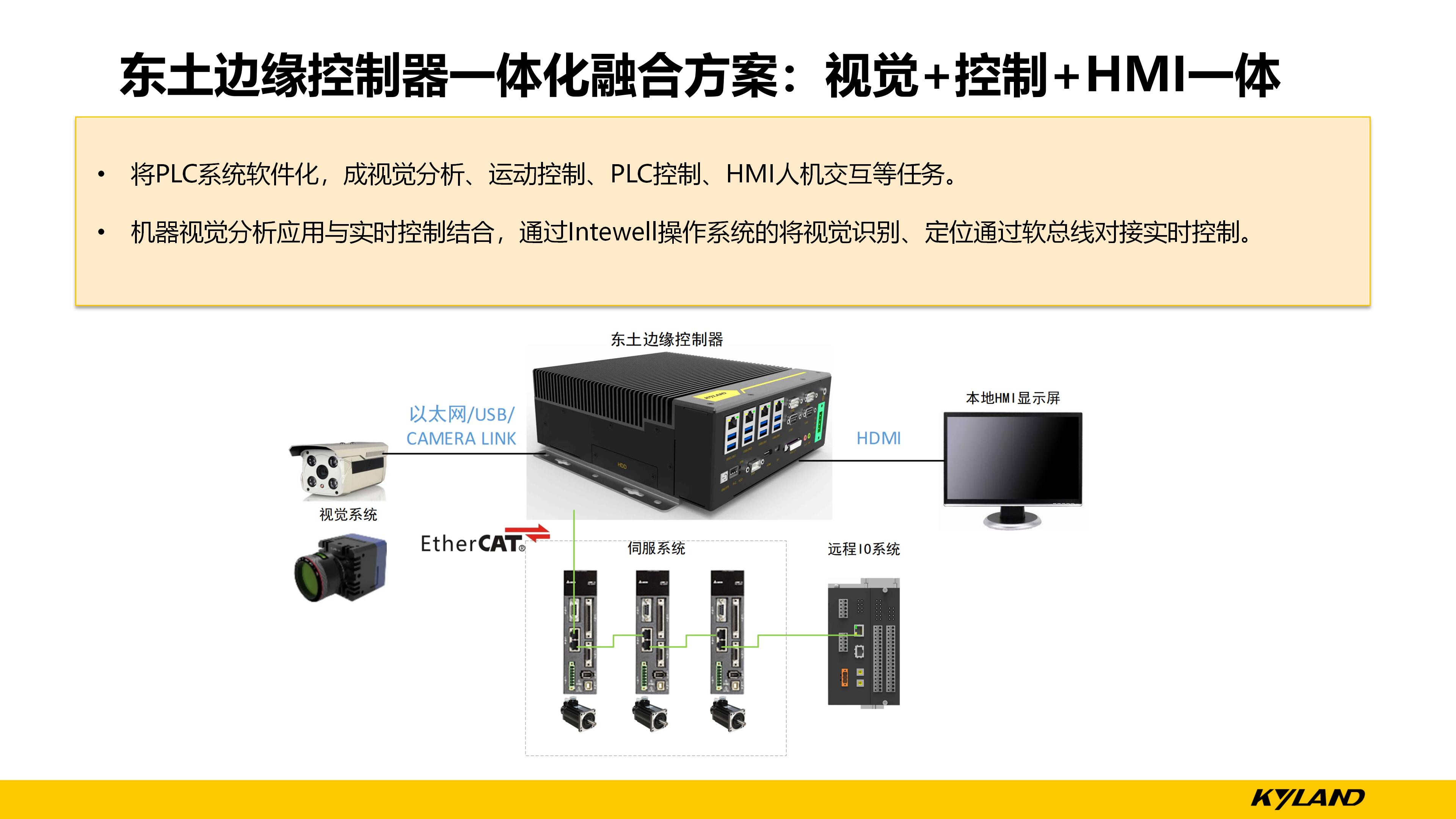以往常規方式是工控機+運動控制板卡結合,將不同功能的獨立系統進行集成,但是這樣的方案存在一定的缺點,例如,各獨立系統的數據互通效率低下,同步控制效果差,開發時間長,集成難度大。而東土科技的視覺+控制+HMI一體化解決方案能夠將PLC軟件化,將機器視覺分析應用與實時控制之間通過Intewell操作系統的虛擬軟總線進行數據交互,具備數據同步快,開發時間短,集成易維護等優點,例如:視覺定位出來的物體空間坐標位置點,通過虛擬軟總線以變量形式發送給實時控制應用,虛擬化PLC就可以快速執行控制動作,所有數據都是在邊緣控制器內部完成的,而且比以往的分立式系統減少了空間占用,降低了運維難度。
