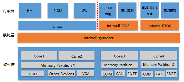 Intewell操作系統基于微內核的虛擬化技術,構建了列車控制系統的底層技術平臺。如下圖所示,Intewell對上承載基礎控制軟件及面向軌交的行業應用軟件,支撐智能化應用,對下兼容各類硬件設備和處理器,支持WTB/MVB/CAN總線及以太網通訊。
