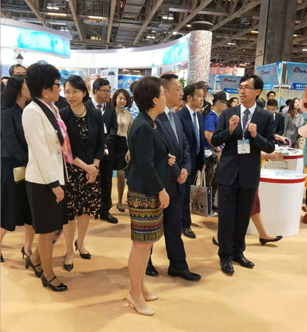 石景山副區(qū)長周西松帶領(lǐng)澳門特區(qū)經(jīng)濟(jì)財(cái)政司司長梁維特、北京市副市長程紅等領(lǐng)導(dǎo)參觀石景山企業(yè)展區(qū)