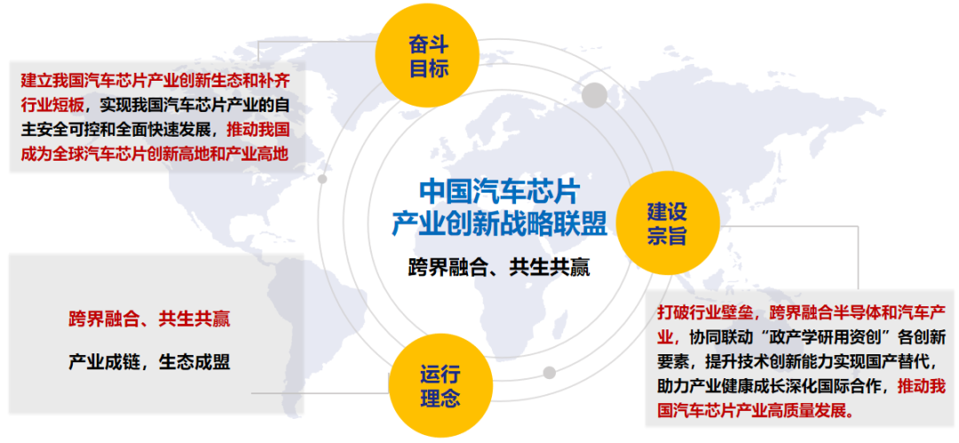 聯(lián)盟跨界融合汽車和芯片兩大產(chǎn)業(yè),聯(lián)合產(chǎn)業(yè)鏈上下游共同組建,主要包括了整車企業(yè)、汽車芯片企業(yè)、汽車電子供應(yīng)商、汽車軟件供應(yīng)商、高校院所、行業(yè)組織等共70余家企事業(yè)單位。聯(lián)盟以“跨界融合、共生共贏、產(chǎn)業(yè)成鏈、生態(tài)成盟”為運(yùn)營(yíng)理念,旨在建立我國汽車芯片產(chǎn)業(yè)創(chuàng)新生態(tài),打破行業(yè)壁壘,補(bǔ)齊行業(yè)短板,實(shí)現(xiàn)我國汽車芯片產(chǎn)業(yè)的自主安全可控和全面快速發(fā)展,推動(dòng)我國成為全球汽車芯片的創(chuàng)新高地和產(chǎn)業(yè)高地。