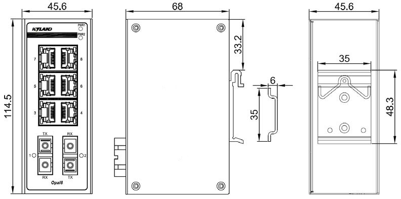 | 機械結構 | 外殼 金屬材質 散熱方式 自然冷卻,無風扇 防護等級 IP30 尺寸 45.6mm×114.5mm×68mm(W×H×D) 重量 0.3Kg 安裝方式 DIN卡軌式或壁掛式 |